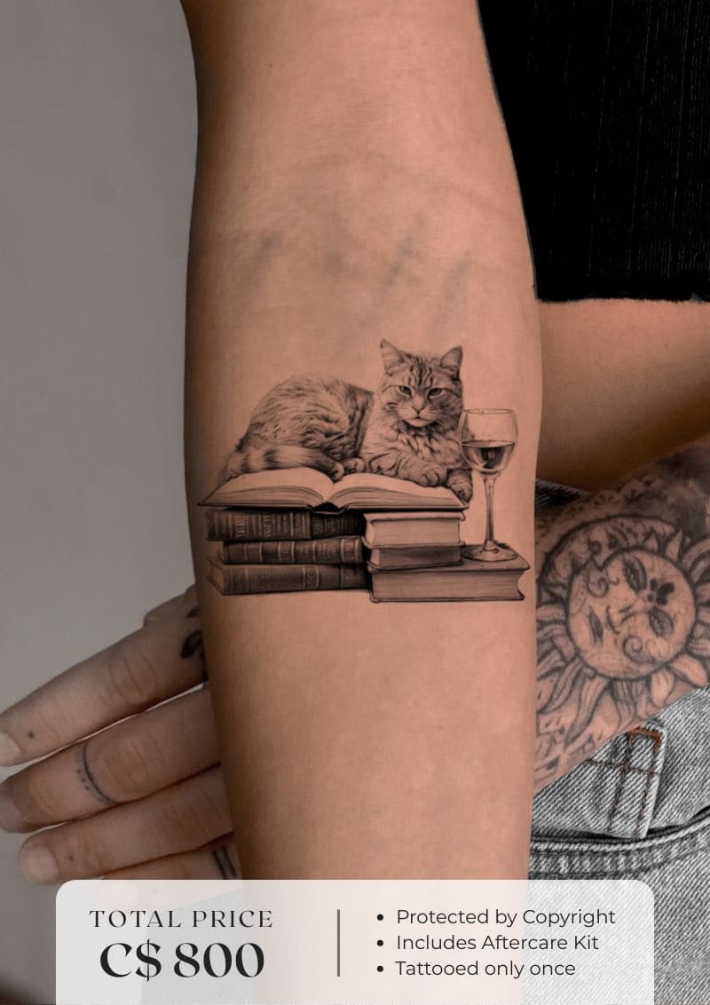 This artwork captures a scene of pure comfort and quiet luxury, a serene cat resting atop a stack of books, beside a half-full glass of wine. Itβs a art to the moments when time slows down and the soul feels at home.Β For those who find peace in literature, joy in solitude, and beauty in simple rituals, this design becomes more than a tattoo, itβs a reminder to cherish what truly soothes the spirit.
