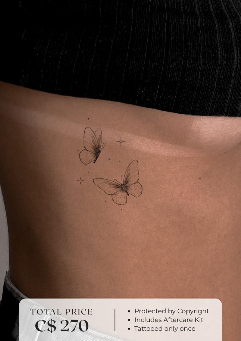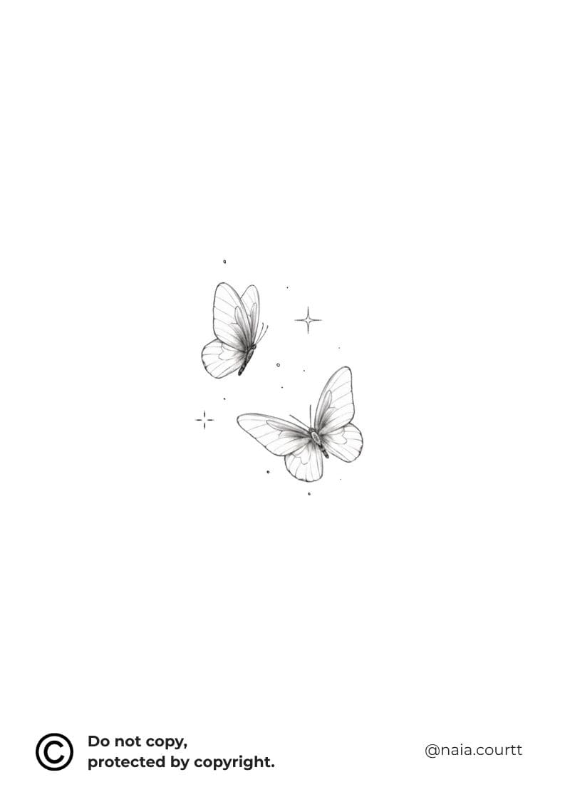 Minimalist and dreamy, this tattoo evokes the magic of stardust and silent transformation. The two butterflies dance among tiny sparks, like constellations finding each other. Perfect for those who carry lightness, delicacy, and poetic mystery in their story.