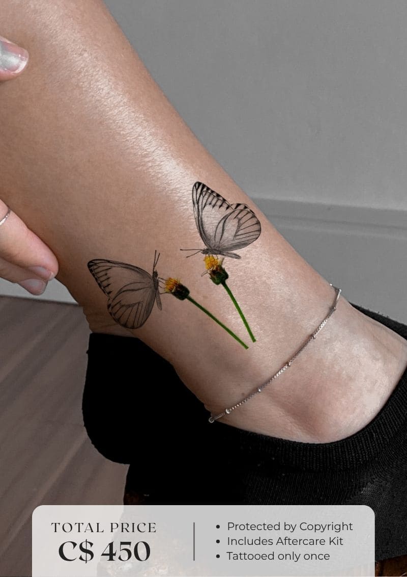 A gentle meeting of two souls in flight. This tattoo captures the sweetness of connection, two butterflies resting in balance, drawn to the same bloom. A poetic reminder of shared paths, fleeting beauty, and the calm found in simple moments.
