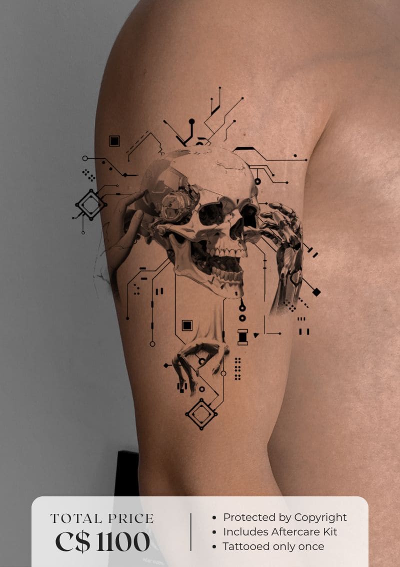 This tattoo captures the haunting beauty of a fractured human skull entwined with robotic hands and digital circuits, a poetic reflection on the merging of humanity and artificial intelligence. Each detail brings forward a question: where does consciousness end and programming begin? This artwork speaks of evolution, memory, and the silent connection between organic thought and mechanical logic. A unique and exclusive piece that blends fine line precision with micro realism textures, transforming your skin into a portal between eras, the past of bones, and the future of machines.