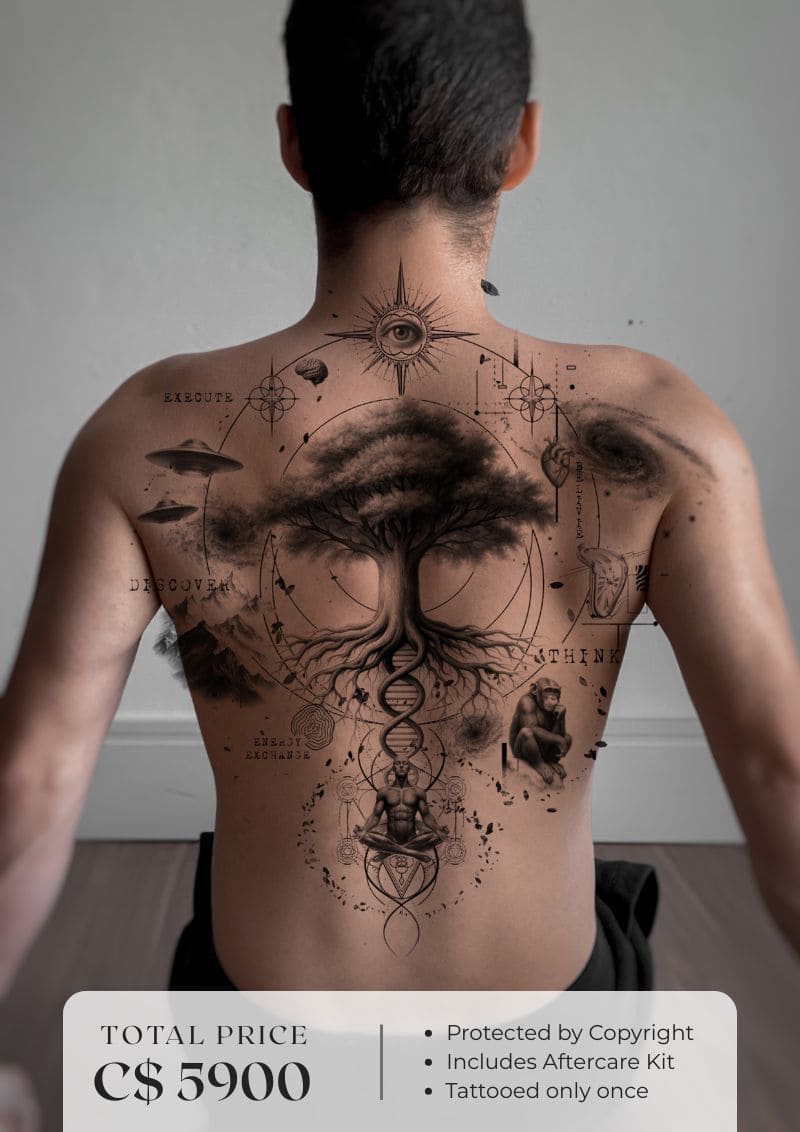 This full back piece was created to represent our deep connection with nature, time and the universe. In the center, the tree of life grows from a body in meditation, representing the vital energy we feel when we reconnect with the Earth. Above, the cosmic eye watches over the expansion of consciousness, while around us we see elements that remind us of our primate origins, our curiosity for the unknown (symbolized by spaceships and galactic systems), and our evolution as thinking beings.
