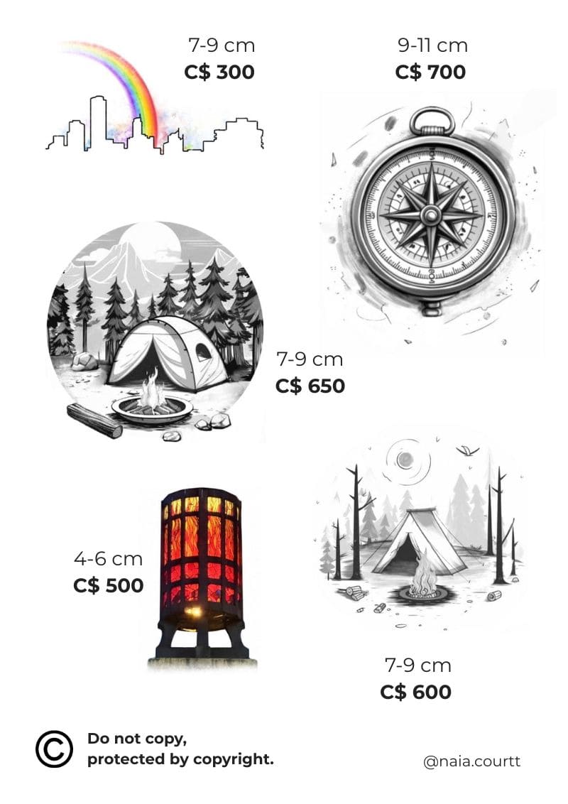 This collection is a tribute to Vancouver’s magical duality: cozy nature meeting urban energy. The designs capture everything from camping cabins nestled in forests to the nostalgic charm of iconic streetlights. Perfect for those who live in or love Vancouver, cherish peaceful moments in nature, and appreciate the unique beauty of the rainy urban landscape. Bring a little piece of the Pacific Northwest to your skin! Choose your favorite and book your appointment.